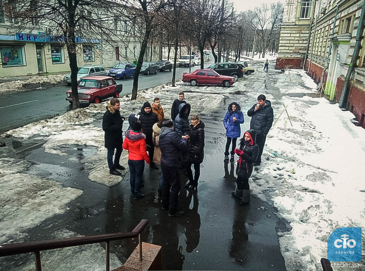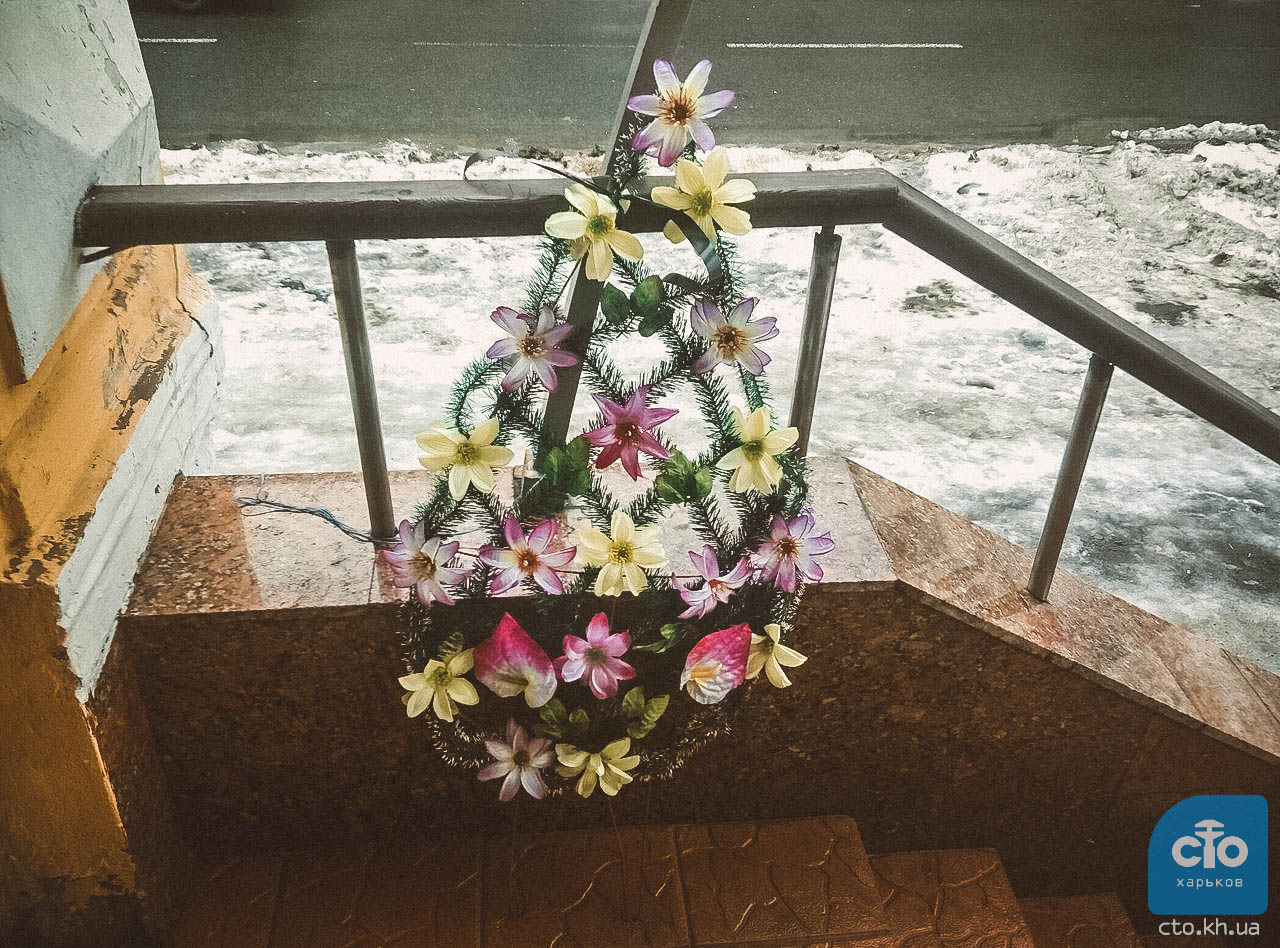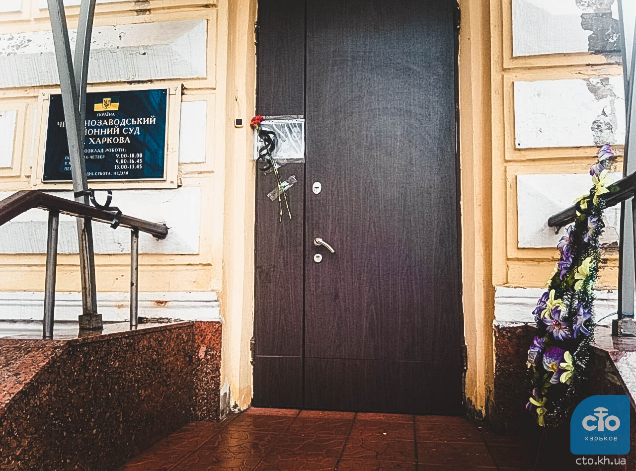 Затем колонна двинулась к Червонозаводскому районному суду г. Харькова. Активисты повесили у входа портрет молодоженов и поставили венок в протест беззаконью суда.