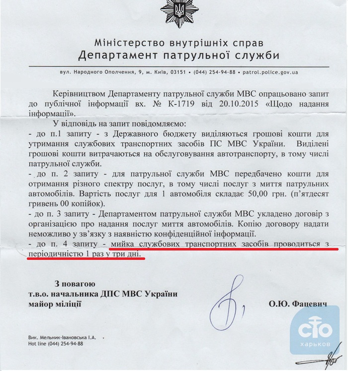 А теперь смотрим в официальный ответ Департамента патрульной службы: мойка служебных транспортных средств проводится с периодичностью один раз в три дня. Проведя нетрудные математические просчёты, можно прийти к выводу, что за одну неделю автомобили должны мыться минимум два раза, а не один. Таким образом, автохозяйство«экономит» для своего кармана 50 гривен. За один месяц (30 дней) мойка должна проводиться 10 раз, а проводится 4–5. Далее, сухие цифры: 50 гривен умножаем на 5 «сэкономленных» моек, результат умножить на 100 патрульных автомобилей. Итого: 25 тысяч гривен в месяц только на мойке. Сколько же ещё, видов заработка на бюджетных средствах реализует новый старый, сохранившийся ещё со времён городского ГАИ, штат автохозяйства? Остаётся только гадать.