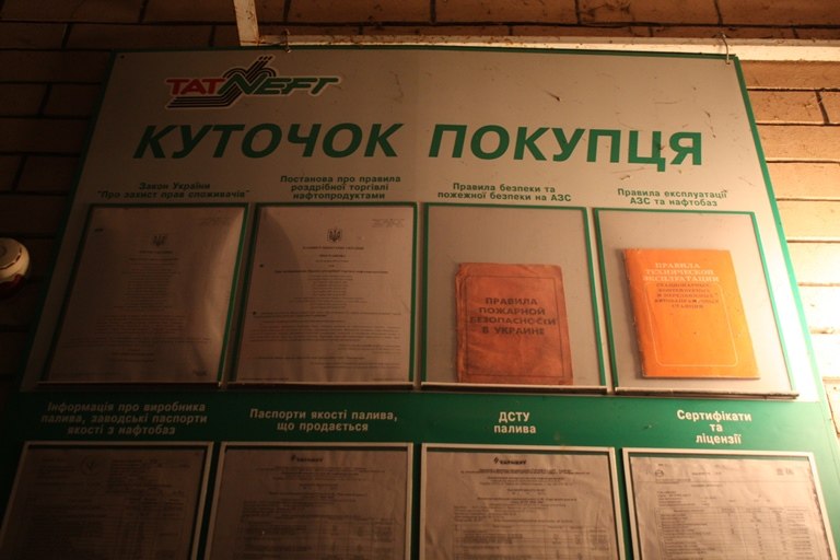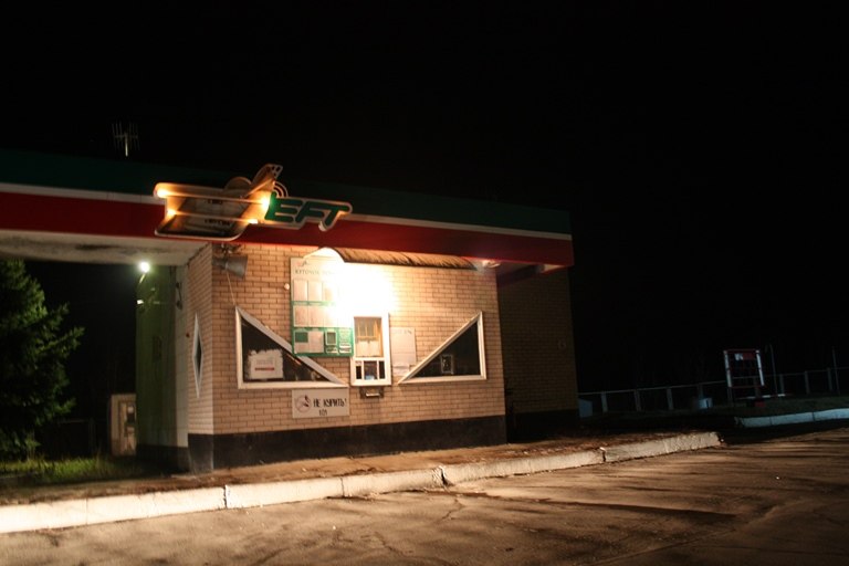 Я заехал на заправку ТНК (на выезде из Золочева), но она оказалась закрыта. На каждой колонке скотчем были приклеены листы А4, на которых вместо привычных «Технический перерыв» или «Закрыто» было ясно и четко напечатано: «НЕТ». И, едва мы успели тронуться проехать 20 метров, мы увидели полуразрушенную заправку, совдеповского вида на которой была разбитая вывеска «TATNEFT» .