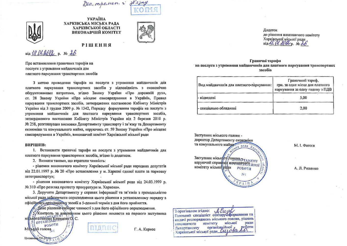 Главным вопросом встречи для нас было обсуждение Рішення Виконкому №26 от 18.01.12 «Про встановлення граничних тарифів на послуги з утримання майданчиків для платного паркування транспортних засобів» его практическом применении на дорогах и площадках для парковки Харькова. В частности хотелось спросить о действии данного решения вблизи станции метро академика Барабашова.
