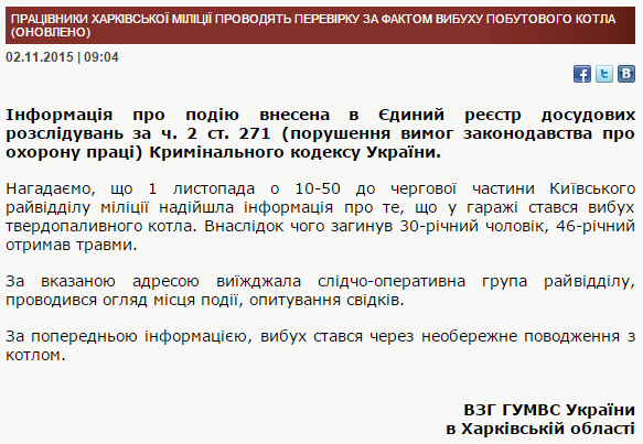 В результате взрыва, на месте погиб 30-летний мужчина, еще один, возраста 46 лет, получил множественные травмы - сообщает ГУМВД Украины в Харьковской оласти. По данному факту открыто уголовное производство за нарушение требований законодательства об охране труда.