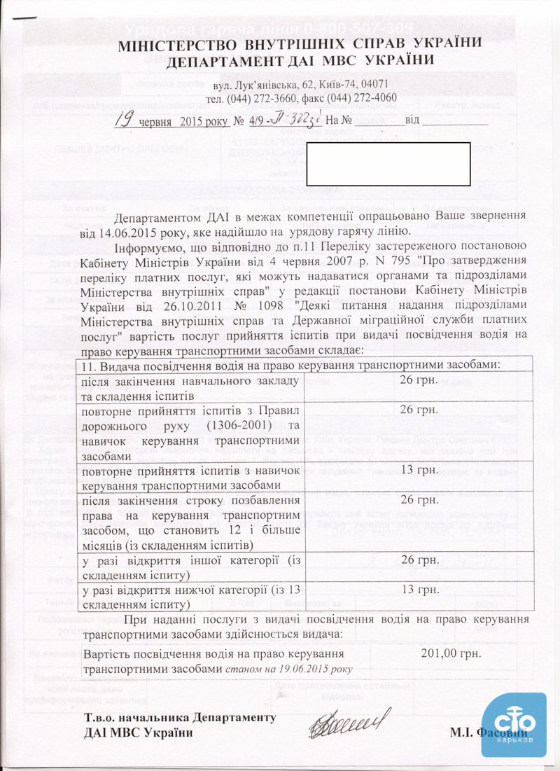На основании приказа МВД №515, вы должны компенсировать ГАИ стоимость бланковой продукции удостоверения водителя, которая по состоянию на 19.06.2015 составляет 201 грн, 00 коп и подтвердить это соответствующей квитанцией.
