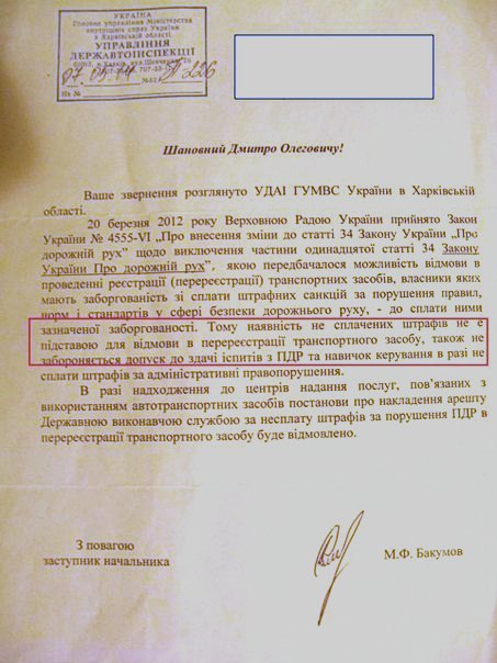 2. Ранее Законом Украины "О дорожном движении", а именно статьей 34, предусматривалось такое право отказа, но 20.03.2012 Верховной радой были внесены изменения в этот закон, в частности в эту статью и в данный момент в ней не предусматривается право отказать в случае не оплаченных штрафов за административные правонарушения.