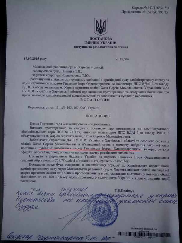 Но, к большому сожалению для сотрудников ГАИ, Игорь не опустил руки и продолжил искать справедливость. Он незамедлительно обратился в Московский районный суд г. Харькова с иском об отмене постановления. Стоит отметить, что одним из требований в иске, было обязать Управление ГАИ в Харьковской области и лично инспектора, составившего протокол, принести публичные извинения.